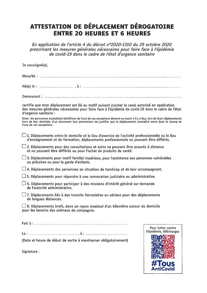 Le confinement jusqu’alors en vigueur a laissé place le 15.12.2020 à un couvre-feu allant de 20h00 jusqu’à 6h00. Les sorties sont autorisées uniquement pour les motifs listés sur l’attestation, qui reste obligatoire en cas de sortie entre 20h00 et 6h00.