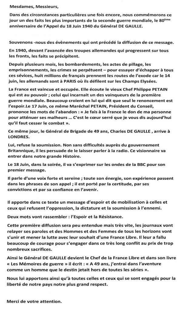 Le 18 juin 1940, Il y a 80 ans le Général de GAULLE refusait la défaite et appelait les Françaises et les Français à continuer le combat…