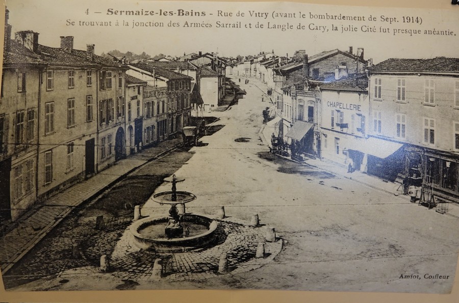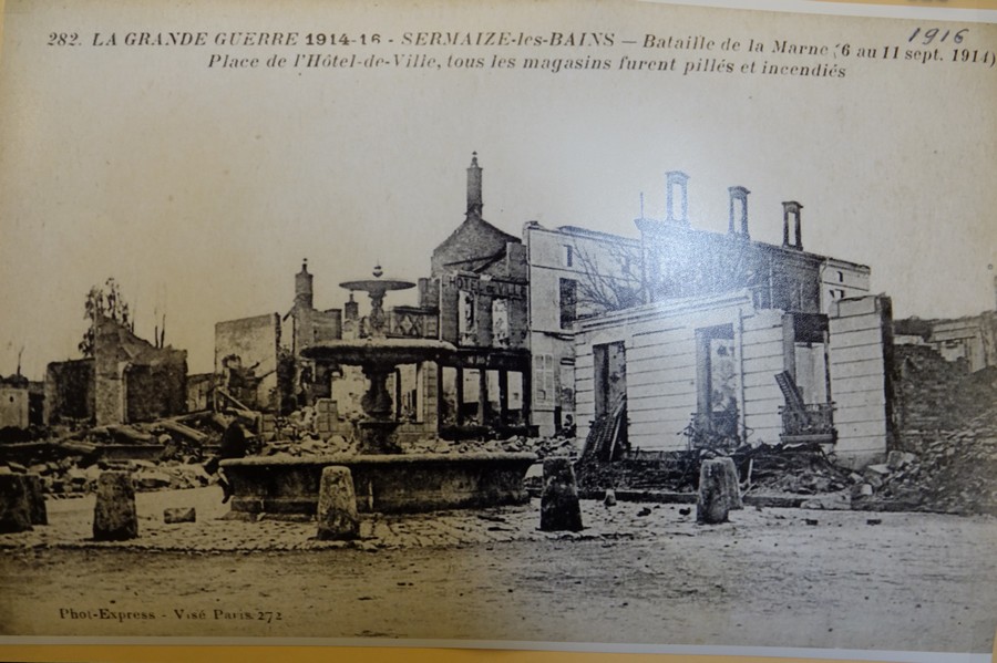 Un des symboles de notre commune lors de cette guerre, est notre Fontaine sur la place principale de notre cité, elle est restée « debout » témoin des terribles bombardements lors de la première bataille de la Marne du 6 au 12 septembre 1914 et lors des combats qui ont suivi. Cet ouvrage a résisté alors que le Sermaize d’avant guerre était bien mort et où rien ne subsistait de sa vie économique et de son histoire.