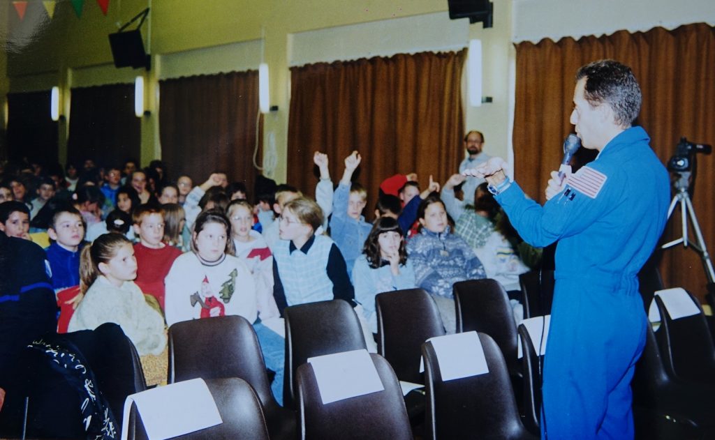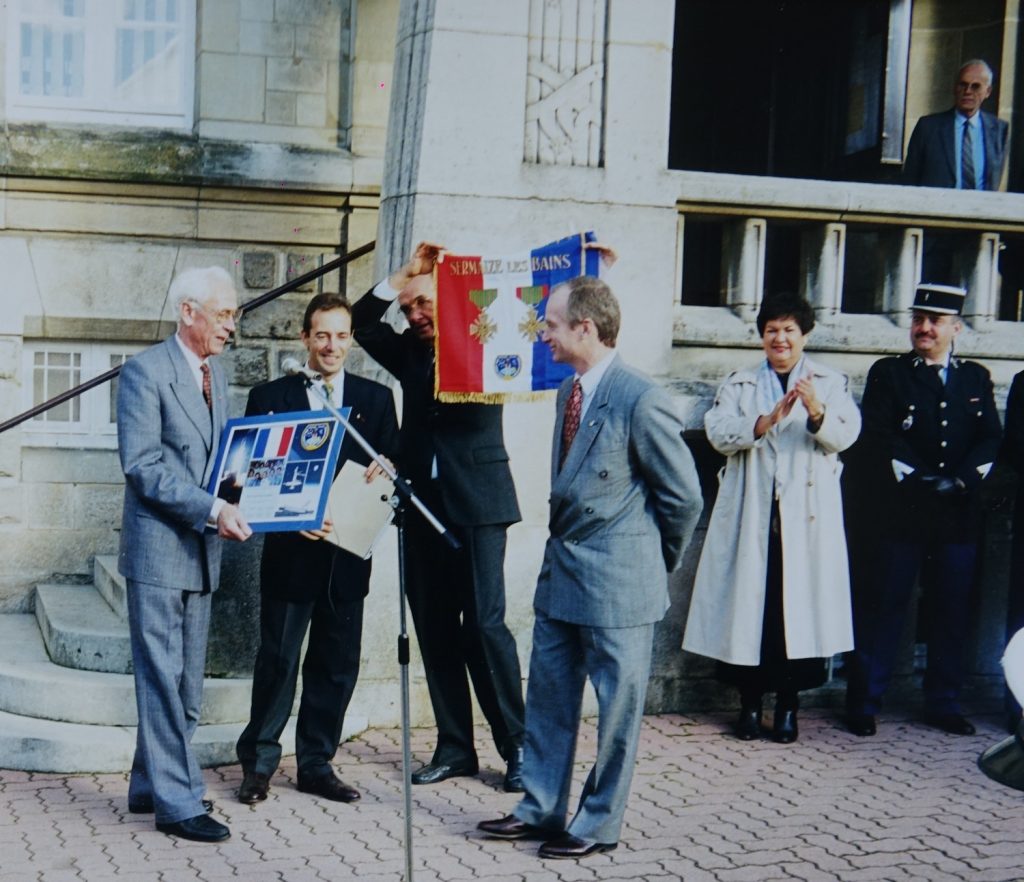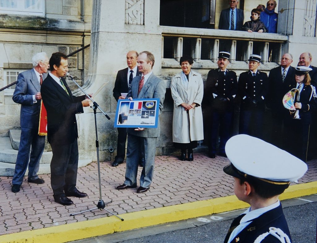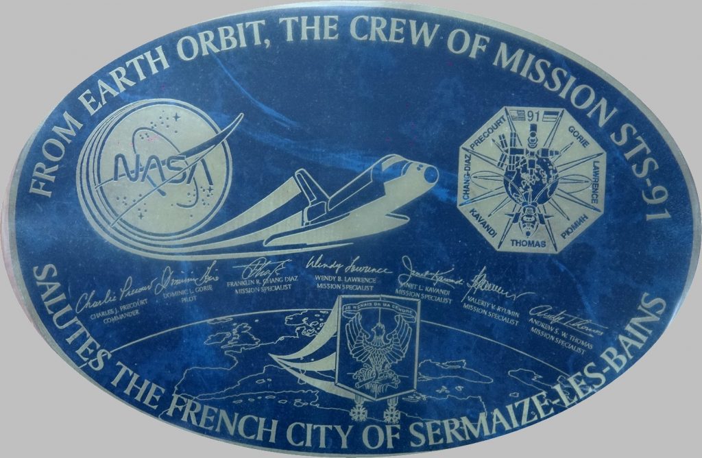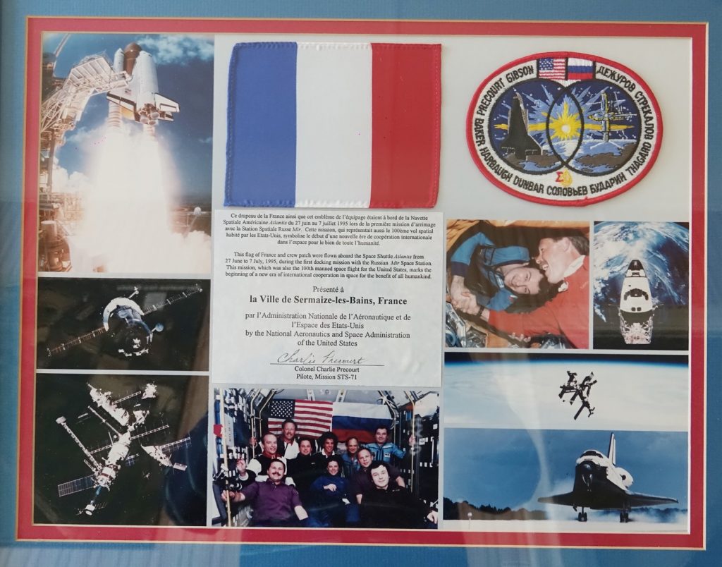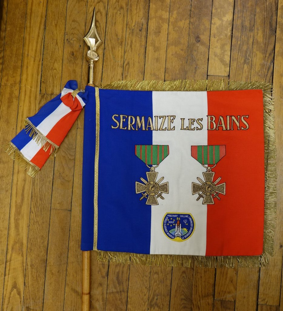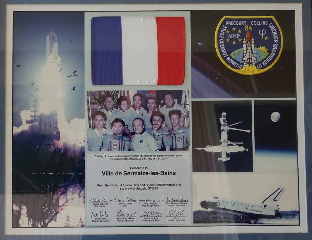 C’était en 1995, les Sermaiziens se souviennent qu’un Fanion aux armes de Sermaize, réalisé par Micheline MURAT a voyagé dans l’espace, dans les bagages de Charlie PRECOURT, Lieutenant-colonel de l’US Air Force  au bord de la Navette Spatiale Américaine ATLANTIS.