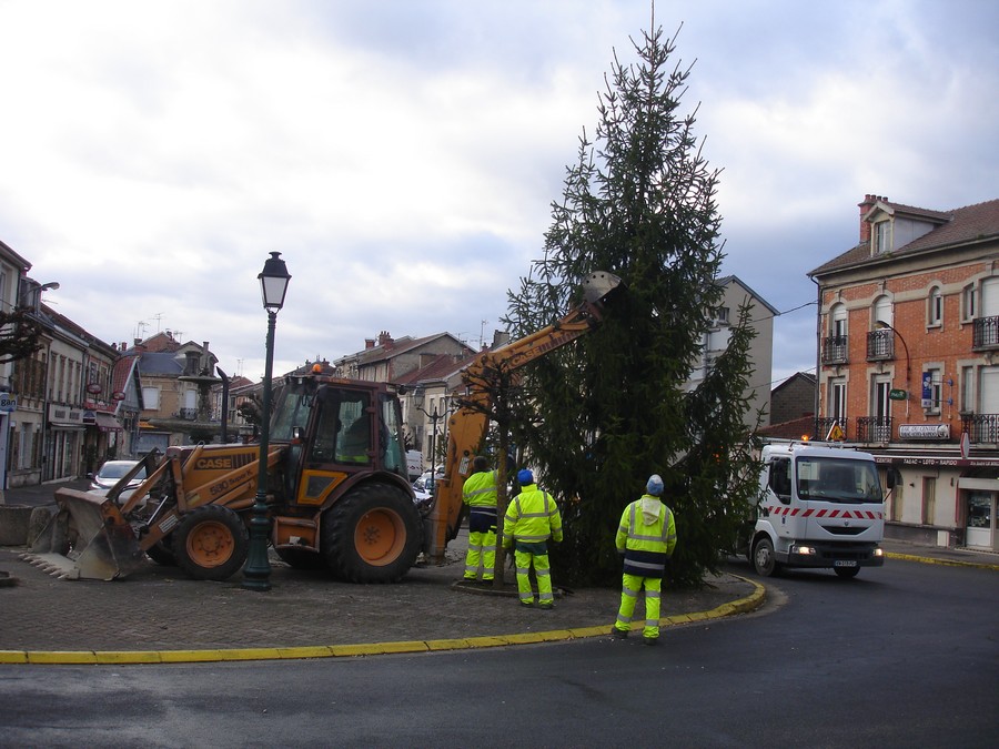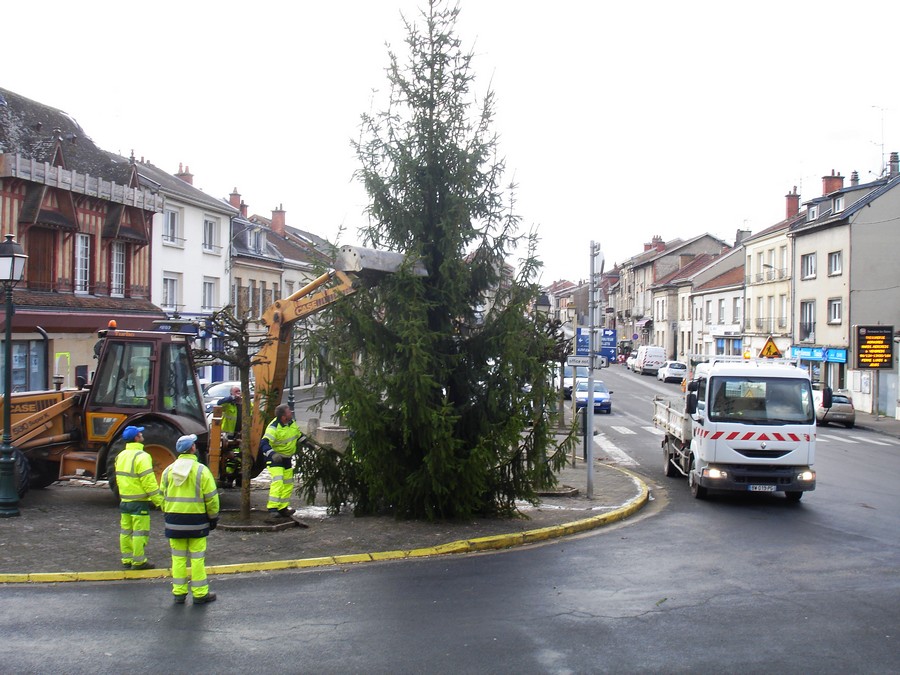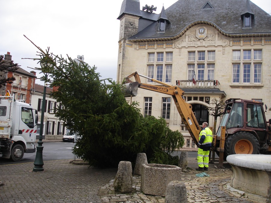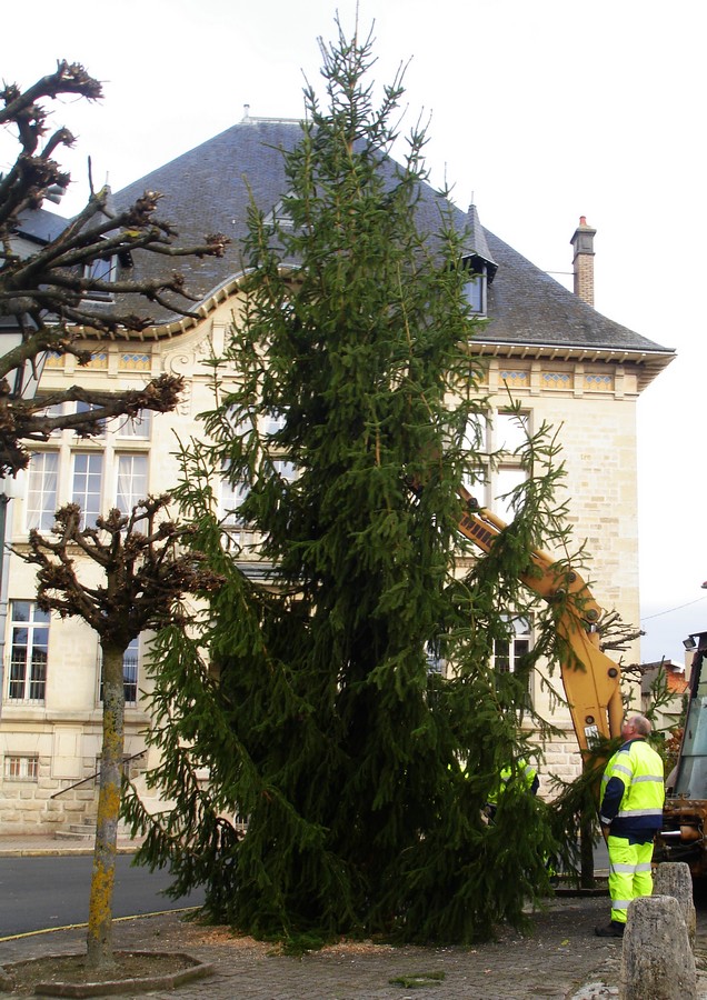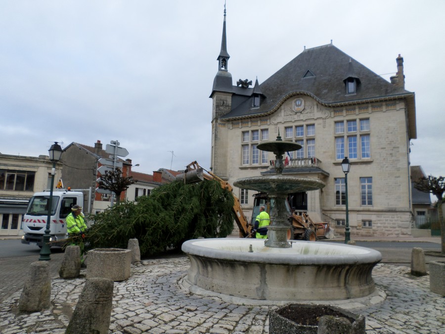 le grand sapin de Noêl a été mis en place ce matin près de la fontaine.