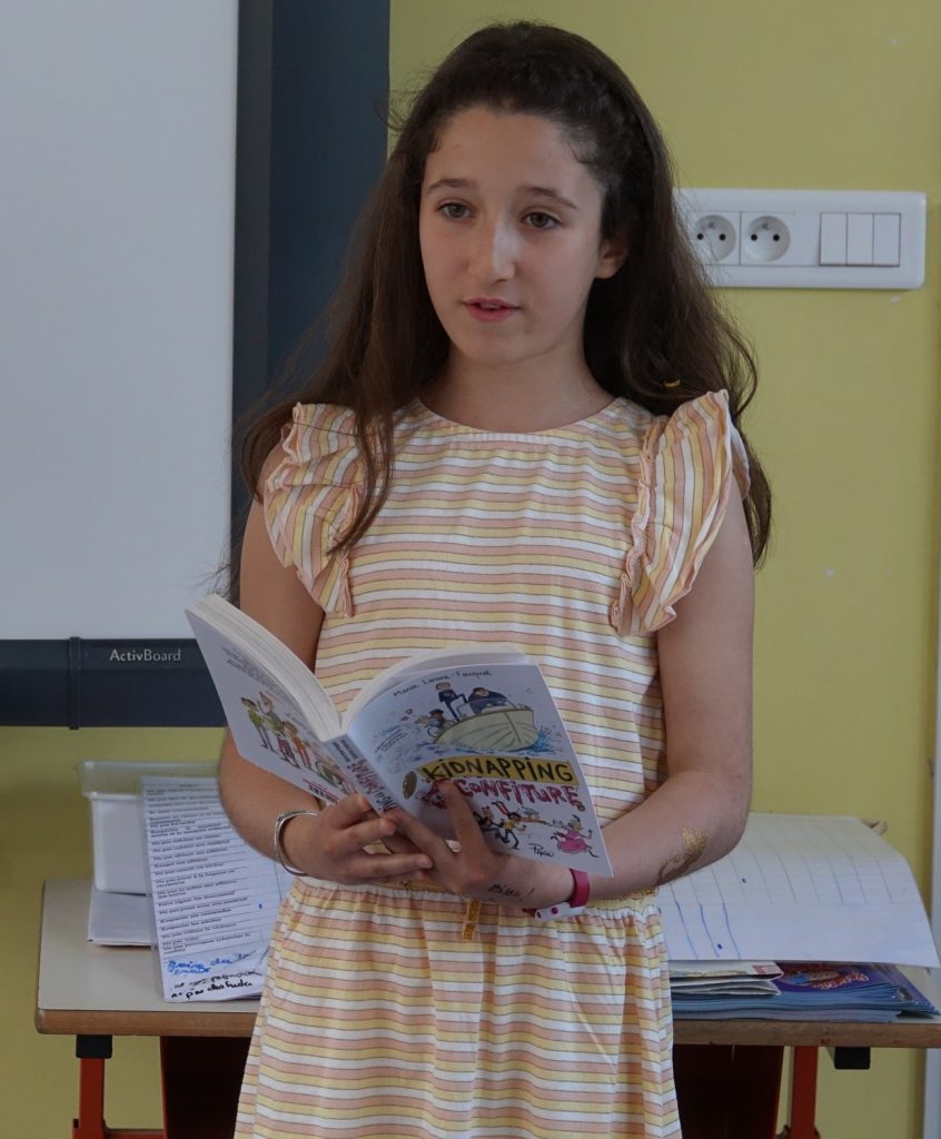 Sélectionnée début février parmi ses camarades de cm2 par un jury à la bibliothèque de Sermaize pour représenter en mars son école au championnat départemental puis régional de lecture à voix haute, Dehlia SOUFI a enchanté une nouvelle fois le jury; finaliste cette fois pour la région « Grand EST », Dehlia s’est retrouvée en finale ce 26 juin à Paris à la Comédie Française parmi les 13 autres finalistes de la France Métropolitaine et d’Outre-mer. Notre petite championne a retrouvé l’autrice du livre dont elle avait choisi de lire un extrait: « Kidnapping à la confiture » de Marie Lenne FOUQUET, la classe l’avait d’ailleurs rencontrée ce 14 juin à l’école où elle avait eu la gentillesse de venir présenter son parcours d’autrice de livres pour enfants.