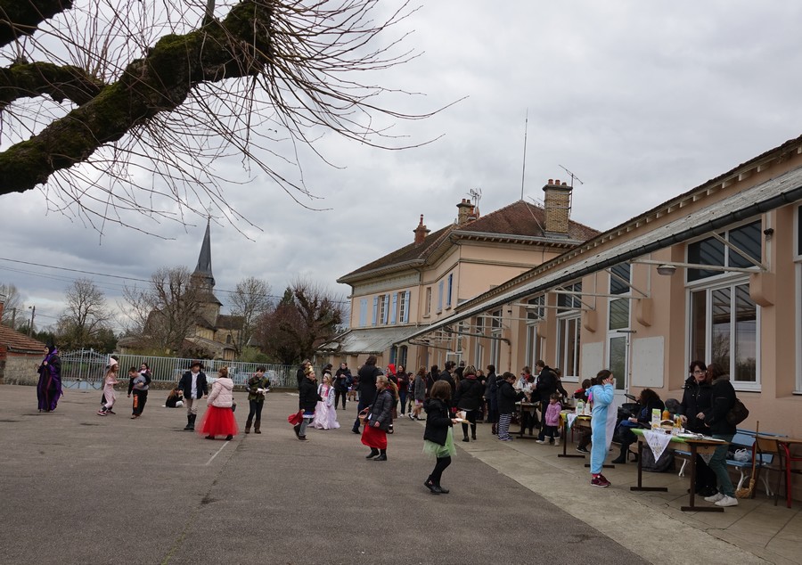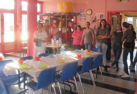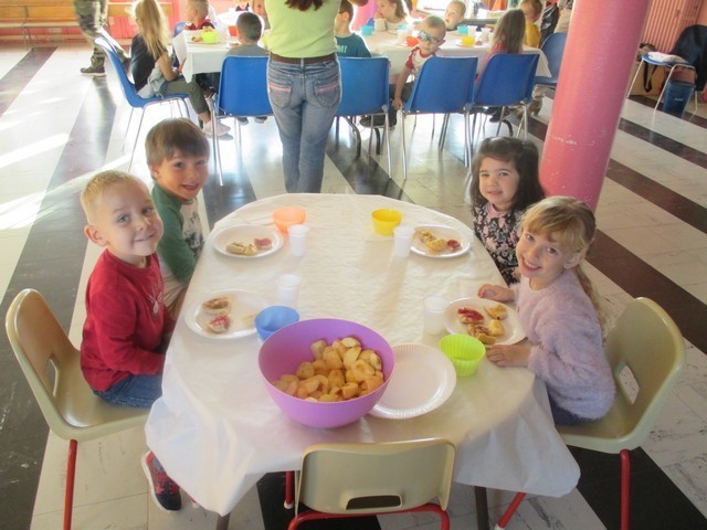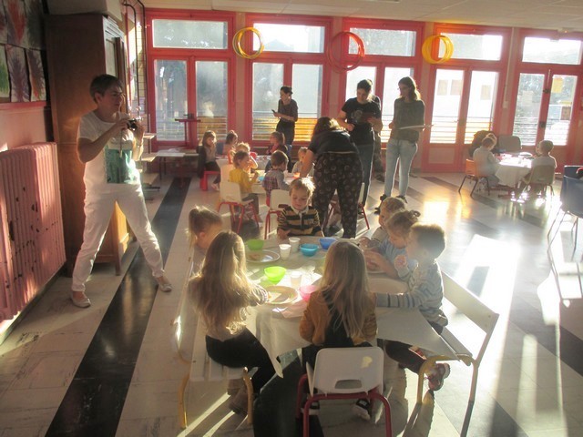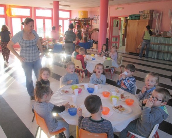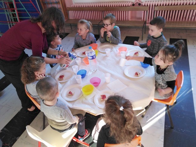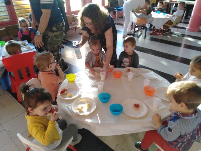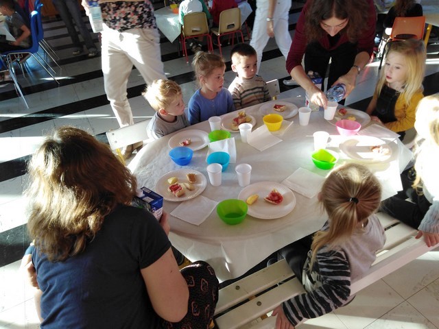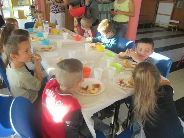 Au programme : tartines de confiture faites dans les classes sur baguette de pain frais, morceaux de pommes et de poires. Lait et eau.