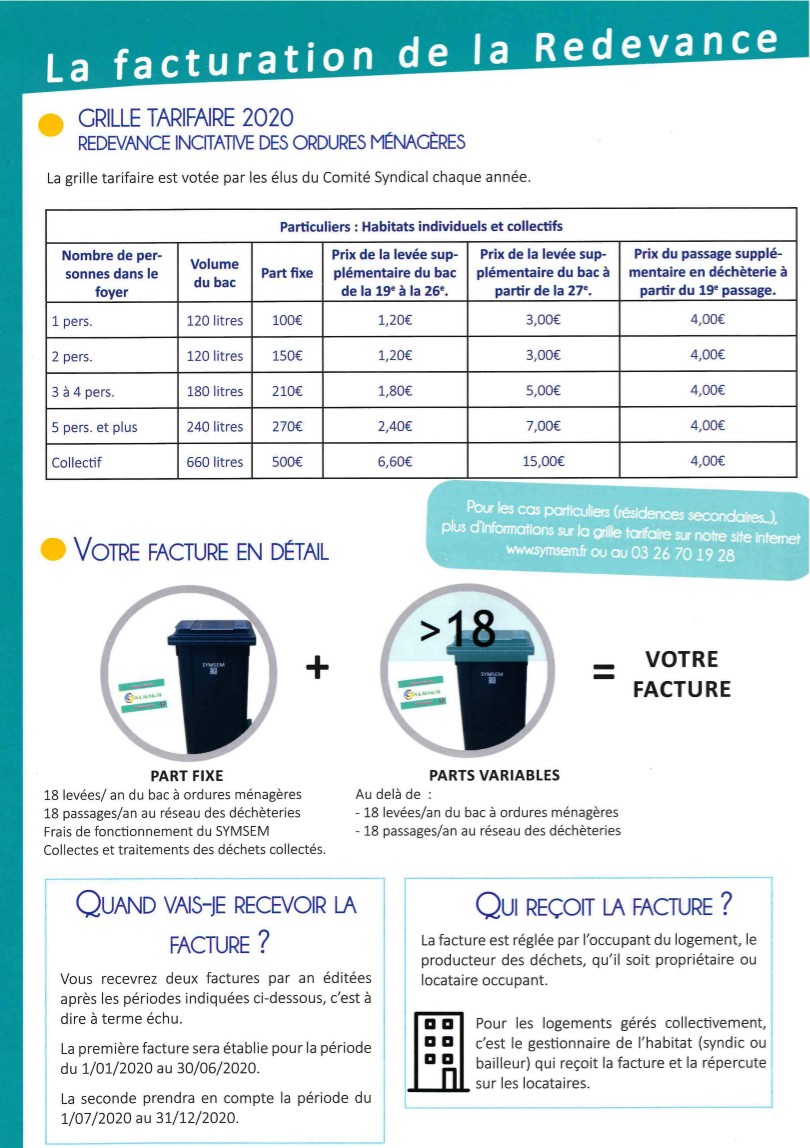 Redevance incitative des ordures ménagères. Grille tarifaire 2020.Accueil / Actualités / Redevance incitative des ordures ménagères. Grille tarifaire 2020. Plus d’infos: https://www.symsem.fr/redevance-incitative/tarification-et-facturation/grille-tarifaire/