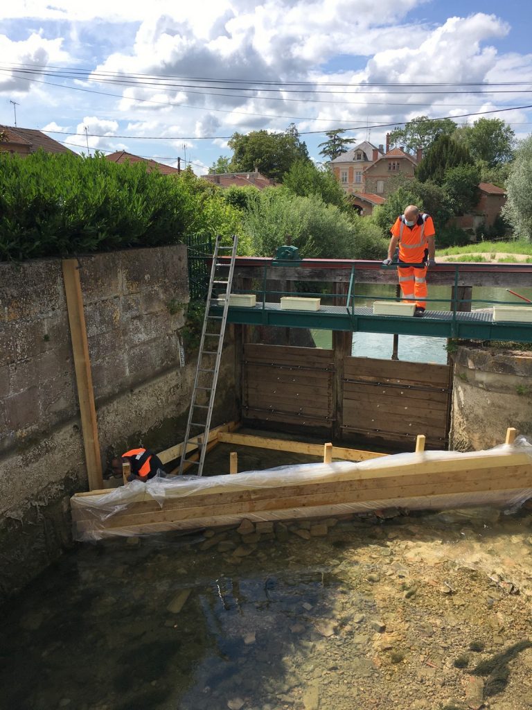 Deux portes des vannes avaient subit les outrages du temps, il fallait les remplacer. Il a fallu dans un premier temps créer un barrage en planches afin de travailler dans des conditions optimales.