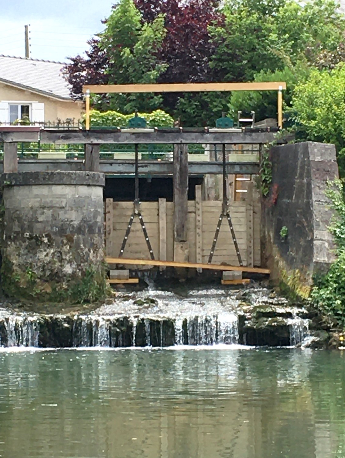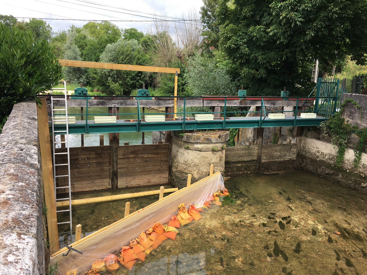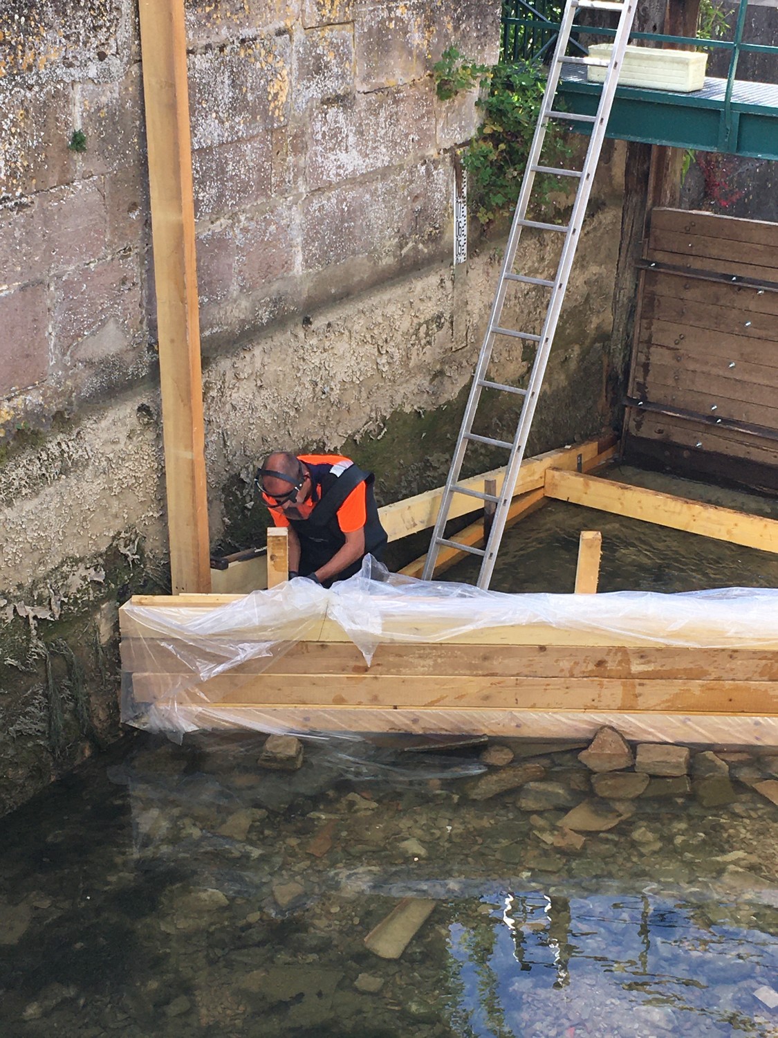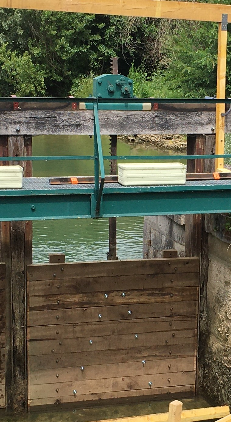 Deux portes des vannes avaient subit les outrages du temps, il fallait les remplacer. Il a fallu dans un premier temps créer un barrage en planches afin de travailler dans des conditions optimales.