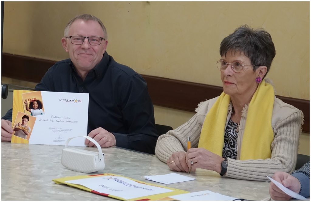 C’est à l’entracte que « Nanar » membre actif de l’ARAS a remis, en présence de Monique CUGNOT Miss Handi FRANCE, de Germaine MORIZET et de Claire ROBIEUX responsable réseau TELETHON Grand Est, un chèque de 1600 euros, bénéfice du loto organisé dimanche 24 novembre.