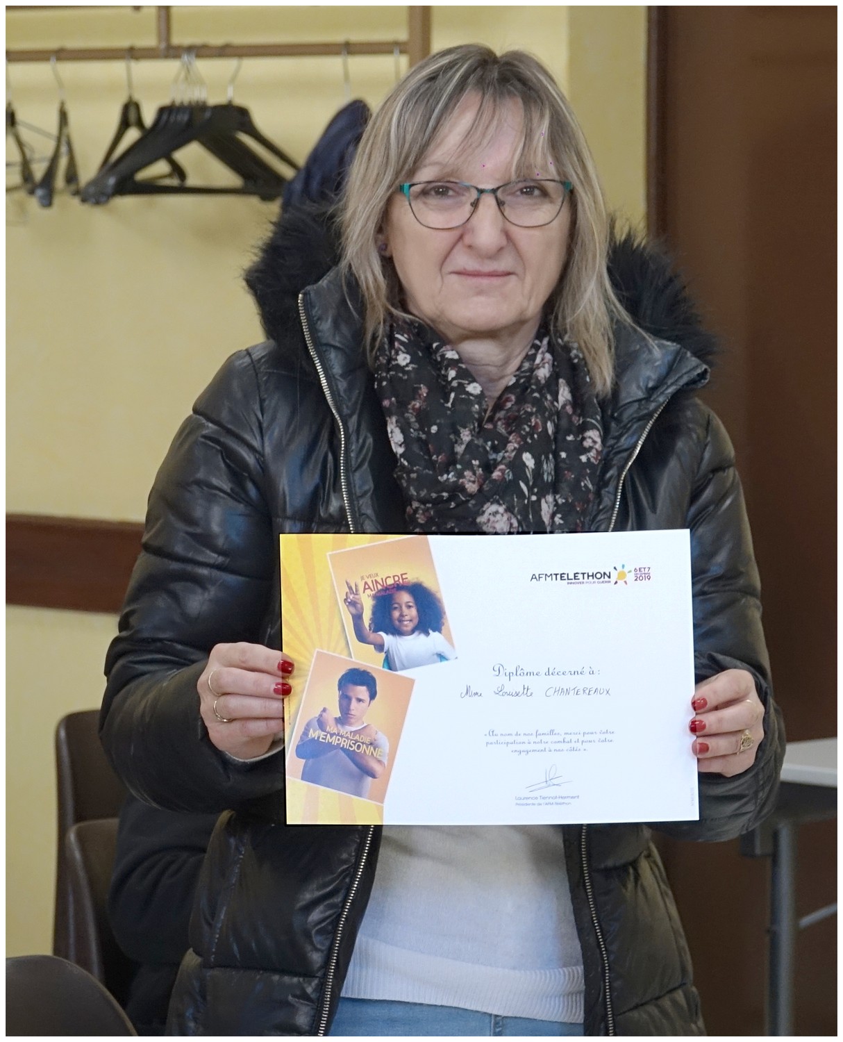 Ce samedi, le « Groupe TELETHON Sermaize » organisait, en présence de Germaine MORIZET de la coordination MARNE et Monique CUGNOT, Miss Handi France 2019 marraine de l’AFM Téléthon MARNE EST, une remise officielle de diplômes afin de remercier tous les acteurs des diverses manifestations pour le téléthon 2019.
