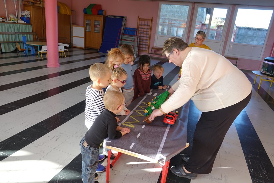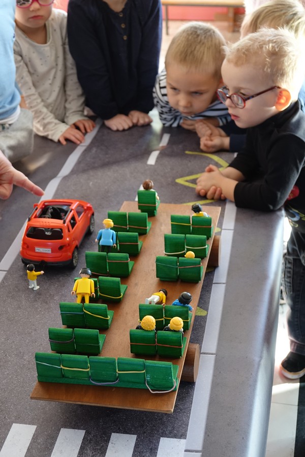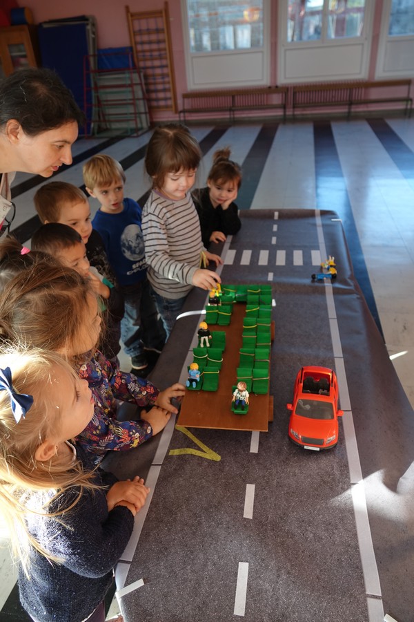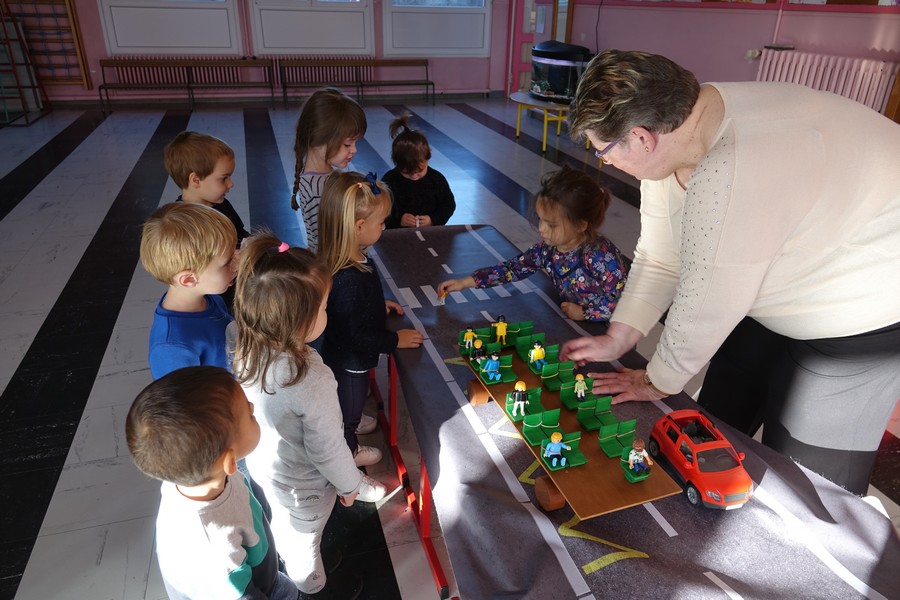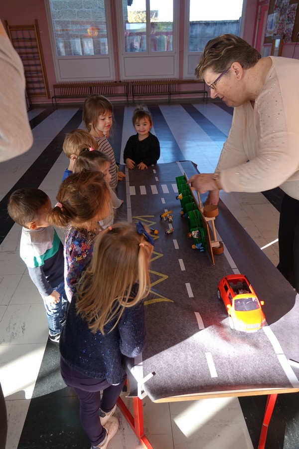 Afin de sensibiliser les petits élèves, Mme PINTAT animatrice de l’ADETEEP a présenté une maquette de car où chaque enfant plaçait un playmobil en situation: en cas d’accident les enfants transportés qui ne sont pas attachés sont éjectés, ont constaté les petits voyageurs.
